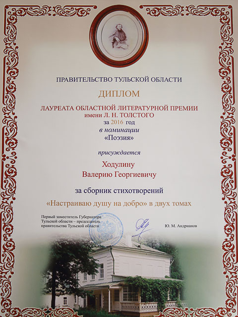 На торжественном заседании, посвящённом Дню работника культуры, состоявшемся в колонном зале дворянского собрания, первый заместитель губернатора Тульской области – председатель правительства Тульской области Юрий Андрианов вручил диплом лауреата областной литературной премии им. Л.Н.Толстого (номинация – «Поэзия») руководителю пресс-центра ПАО «КМЗ» - редактору газеты «Косогорец» поэту Валерию Ходулину.