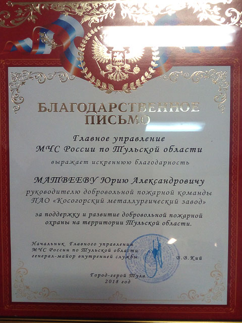 За выдающиеся заслуги в создании и развитии добровольной пожарной охраны, широкой пропаганды знаний в области пожарной безопасности на территории Тульской области самые активные добровольцы были награждены почетными грамотами областного чрезвычайного ведомства. В числе награжденных – начальник службы охраны ПАО «Косогорский металлургический завод» Ю.А.Матвеев, водители (контролеры) пожарного автомобиля В.А.Зудин, В.В.Расходчиков и А.И.Казаков.
