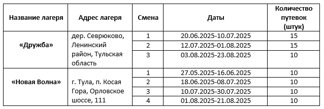 Даты заездов и количество путевок в каждую смену указаны таблице.